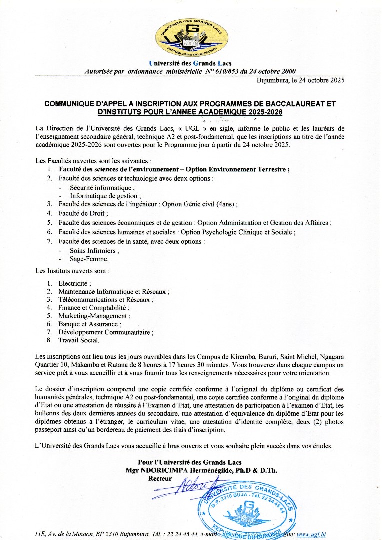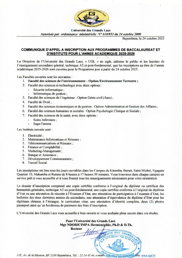 Appel à l’inscription pour l’Année Académique 2025-2026 Posted on 22 janvier 2026 by Webmaster | Firmin NININAHAZWE 0 Laisser un commentaire Annuler la réponseVotre adresse de messagerie ne sera pas publiée. Les champs obligatoires sont indiqués avec *Commentaire * Nom * Adresse de messagerie * Site web