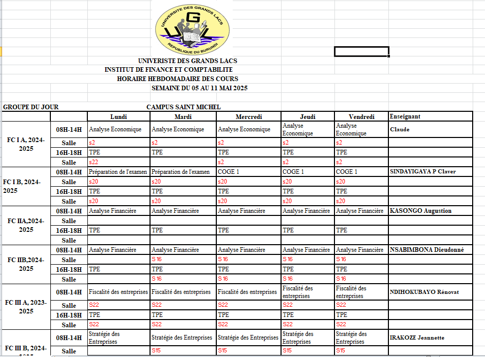Home > Horaires des cours > HORAIRE DES COURS DU 05 AU 11/05/2025:FINANCE ET COMPTABILITE